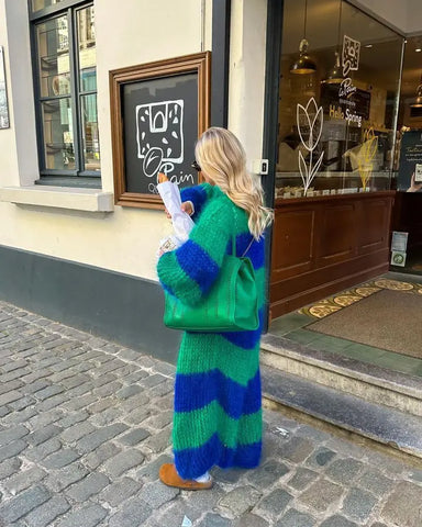 Die Beryl kräftig gestreifte Damenstrickjacke kombiniert Stil und Komfort perfekt und bietet eine gemütliche und modische Schicht zu jeder Jahreszeit. Mit ihren lebendigen Streifen und dem weichen Strickmaterial ist diese Strickjacke darauf ausgelegt, Sie warm zu halten und dabei alle Blicke auf sich zu ziehen. Tragen Sie sie mit Jeans, Röcken oder Kleidern, um Ihrem Outfit eine aufregende und stilvolle Schicht hinzuzufügen.